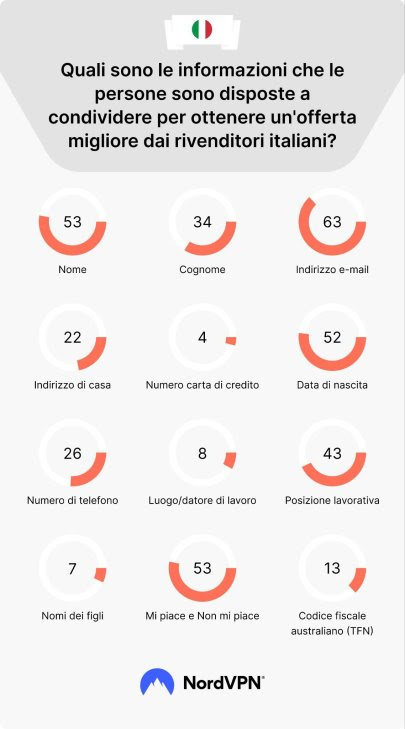 Pur di accedere a sconti sempre più vantaggiosi, gli italiani interessati al Black Friday sembrerebbero disposti a commettere qualche leggerezza che potrebbe minare la propria sicurezza (non per niente in cybersecurity non occupiamo una posizione prestigiosa). Il 50% degli utenti italiani dice che cercherà offerte online per fare acquisti durante il Cyber Monday, Black Friday, o i saldi di Natale, mentre il 40% si dice incerto a riguardo. Il 94% degli italiani è disposto però a fornire qualche dato personale per ricevere regali, bonus, sconti o servizi gratis. Il 4% è pronto a rivelare dettagli sulla propria carta di credito, il 13% il codice fiscale, e l’8% rivelerebbe dove lavora. Il 7% arriverebbe a rivelare i nomi dei propri figli pur di ottenere uno sconto aggiuntivo.