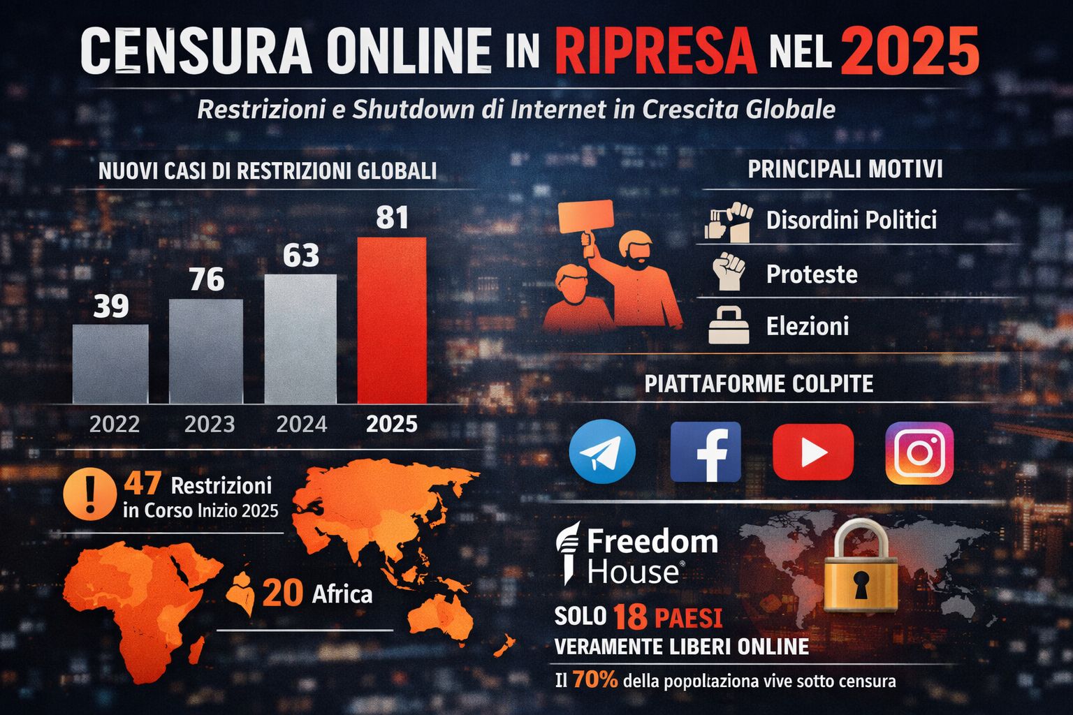 Nel conteggio rientrano interventi diversi tra loro, ma accomunati dallo stesso obiettivo: limitare la circolazione delle informazioni. Si va dal blocco di siti web alle restrizioni su social network e servizi di messaggistica, fino agli shutdown regionali o nazionali della connessione. Sono misure temporanee in molti casi, ma con un impatto concreto sulla possibilità di informarsi, comunicare e organizzarsi online.
