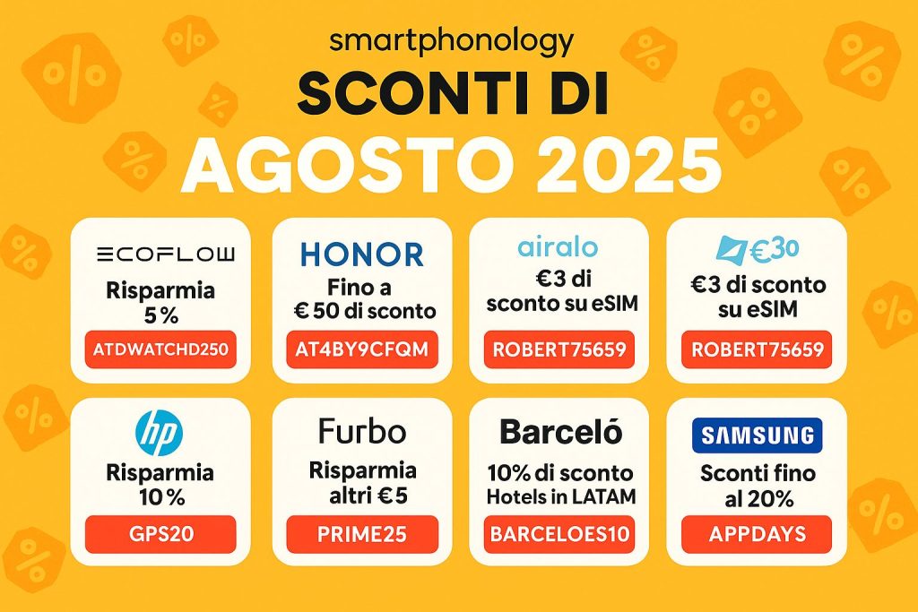 L’estate è il momento perfetto per aggiornare i propri dispositivi, organizzare un viaggio o semplicemente approfittare di un’offerta interessante. Per questo motivo, su Smartphonology abbiamo raccolto in un’unica pagina tutte le promozioni attive ad agosto 2025, frutto delle nostre partnership con i principali brand del settore tech, travel e lifestyle. Gli sconti sono validi per un periodo limitato e in alcuni casi riservati solo ai nuovi utenti o a un utilizzo per cliente. Basta inserire il codice sconto indicato nel carrello, seguendo i link diretti disponibili nella nostra pagina dedicata.