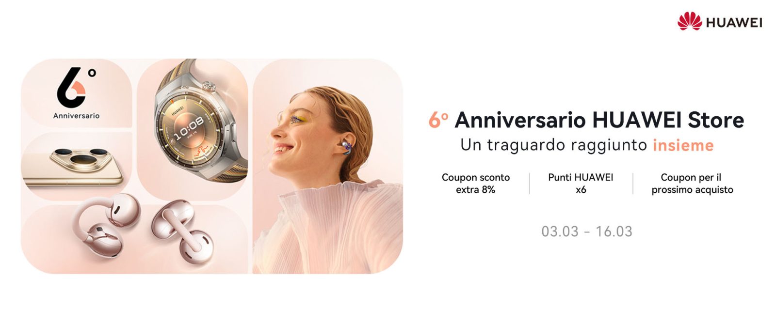 Huawei celebra l’anniversario del proprio store ufficiale in Italia con una campagna promozionale che punta su sconti a tempo, coupon aggiuntivo e un’accelerazione del programma fedeltà. Fino al 16 marzo 2026 lo store propone offerte su più categorie e un extra sconto dell’8% tramite il codice ACSANNI8, valido sull’acquisto dei prodotti inclusi nella promo. Tra i meccanismi principali figura anche la raccolta punti potenziata: durante il periodo della campagna, per ogni euro speso l’utente riceve 6 Punti HUAWEI, utilizzabili in seguito per ridurre il prezzo di futuri acquisti all’interno dello store.