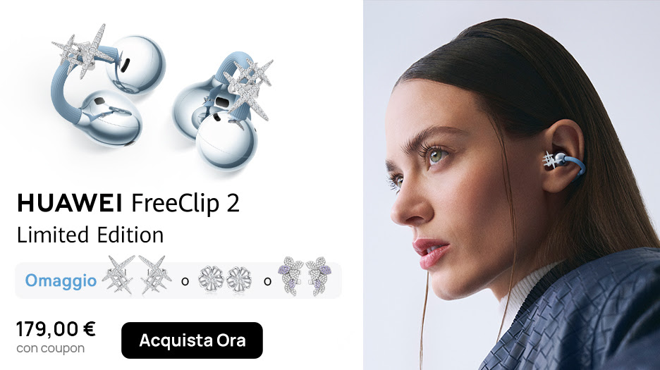 Tra i prodotti messi in evidenza c’è HUAWEI FreeClip 2 (Limited Edition), auricolare open-ear pensato per chi ascolta senza isolarsi dai suoni dell’ambiente. Il prezzo indicato sullo store è €199 e la promo associa un codice dedicato: A20FREECLIP2, che attiva €20 di sconto secondo la pagina di acquisto ufficiale, con accessori legati alla disponibilità.