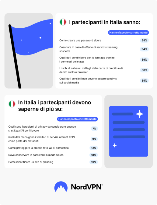 Un ulteriore studio condotto da NordVPN ha rivelato un peggioramento preoccupante a livello globale in termini di consapevolezza sulla privacy online e la cybersicurezza, con l’Italia che è scivolata dall’8° all’11° posto nella classifica mondiale. Questo declino evidenzia una crescente difficoltà degli italiani nel comprendere e affrontare le nuove sfide della sicurezza informatica. Il report di NordVPN, basato su un’indagine chiamata National Privacy Test (NPT), ha mostrato come, nel 2024, il numero di utenti consapevoli, definiti “Cyber Star”, si sia dimezzato rispetto all’anno precedente. Mentre gli italiani continuano a dimostrare competenze solide nella creazione di password forti (98%) e nella gestione di offerte sospette di servizi di streaming (94%), emerge una scarsa consapevolezza su temi cruciali come la privacy legata all’intelligenza artificiale (IA) utilizzata sul lavoro, con solo il 7% degli italiani che dichiara di essere a conoscenza dei relativi rischi.