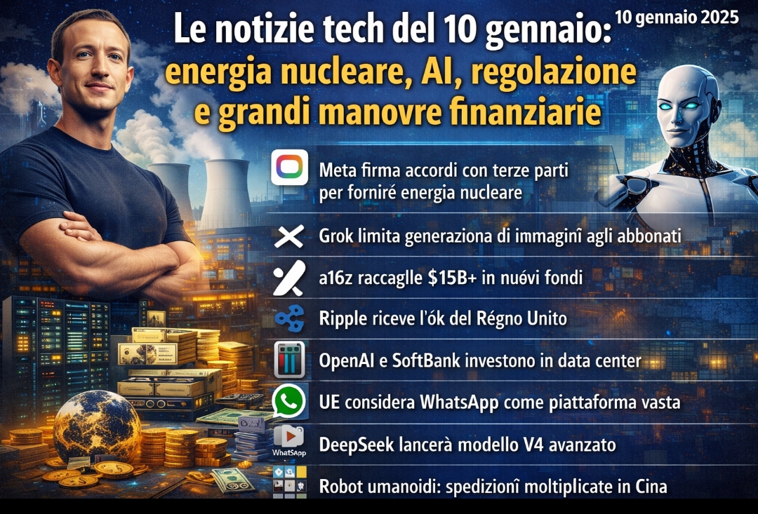 Le notizie tecnologiche del 10 gennaio mettono al centro energia, intelligenza artificiale, regolazione e grandi manovre finanziarie, mostrando come il settore tech sia sempre più intrecciato con infrastrutture critiche, politica industriale e controllo dei contenuti. Dall’accordo di Meta con il nucleare alle polemiche su Grok, passando per il peso crescente dei grandi fondi e per l’accelerazione su AI e robotica, il quadro evidenzia un rafforzamento del potere strutturale dei grandi attori.