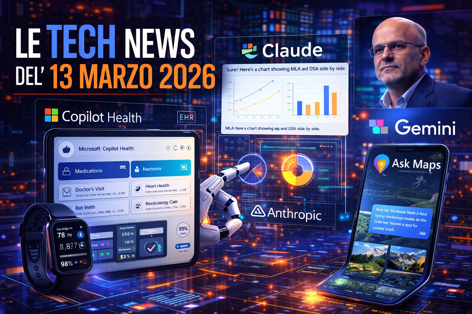 L’ecosistema tecnologico continua a muoversi lungo due direttrici principali: l’integrazione sempre più profonda dell’intelligenza artificiale nei servizi quotidiani e una crescente competizione tra grandi piattaforme per diventare il punto di accesso principale alle applicazioni AI. Il 13 marzo emergono novità che riguardano sanità digitale, strumenti generativi, infrastrutture AI e strategie industriali dei principali gruppi tecnologici. Tra gli annunci più rilevanti figurano il debutto di Copilot Health da parte di Microsoft, nuove funzionalità visuali per Claude di Anthropic e l’introduzione della funzione conversazionale Ask Maps basata su Gemini per Google Maps.