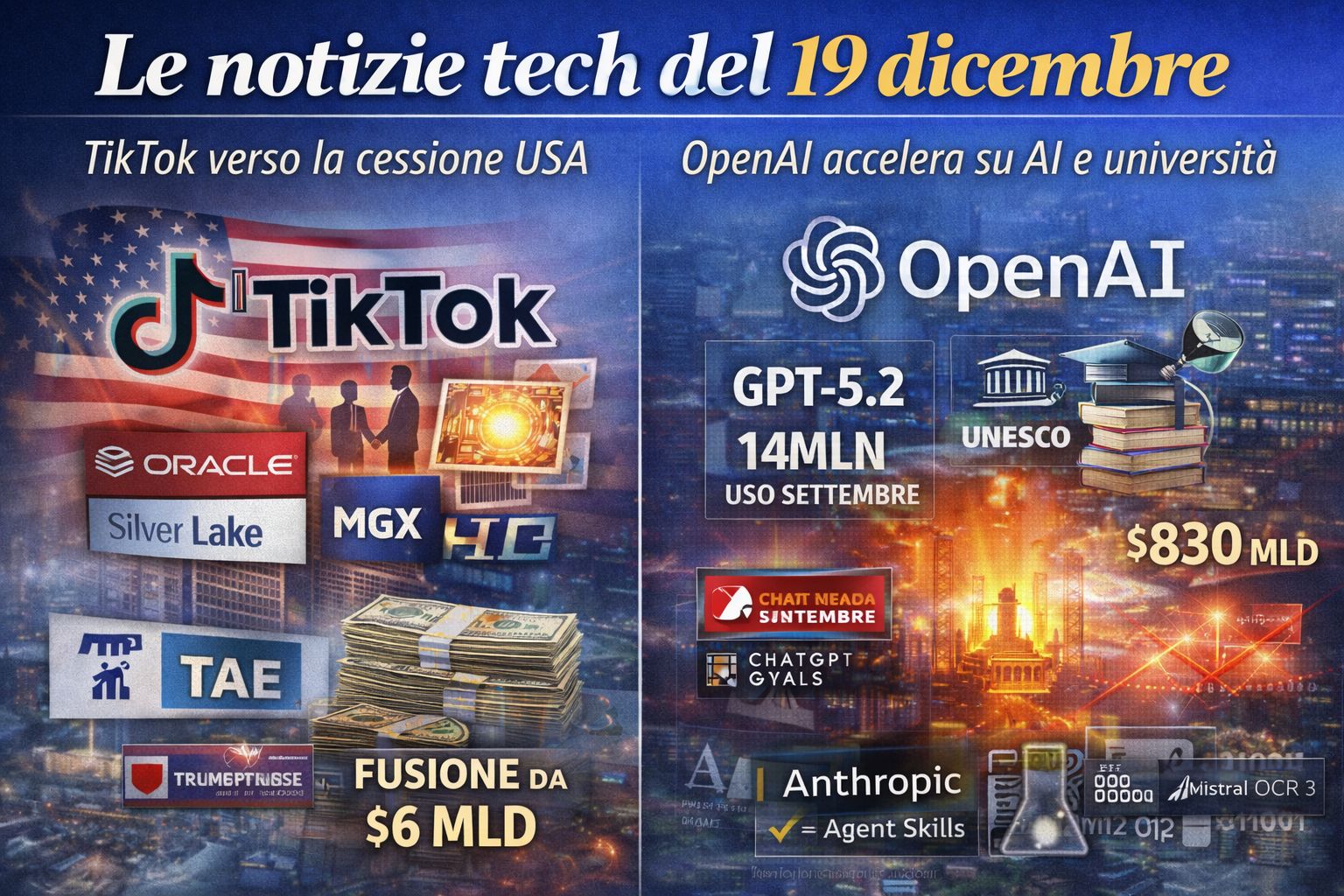 Le notizie tech del 19 dicembre: TikTok verso la vendita della divisione USA; OpenAI accelera su AI e università