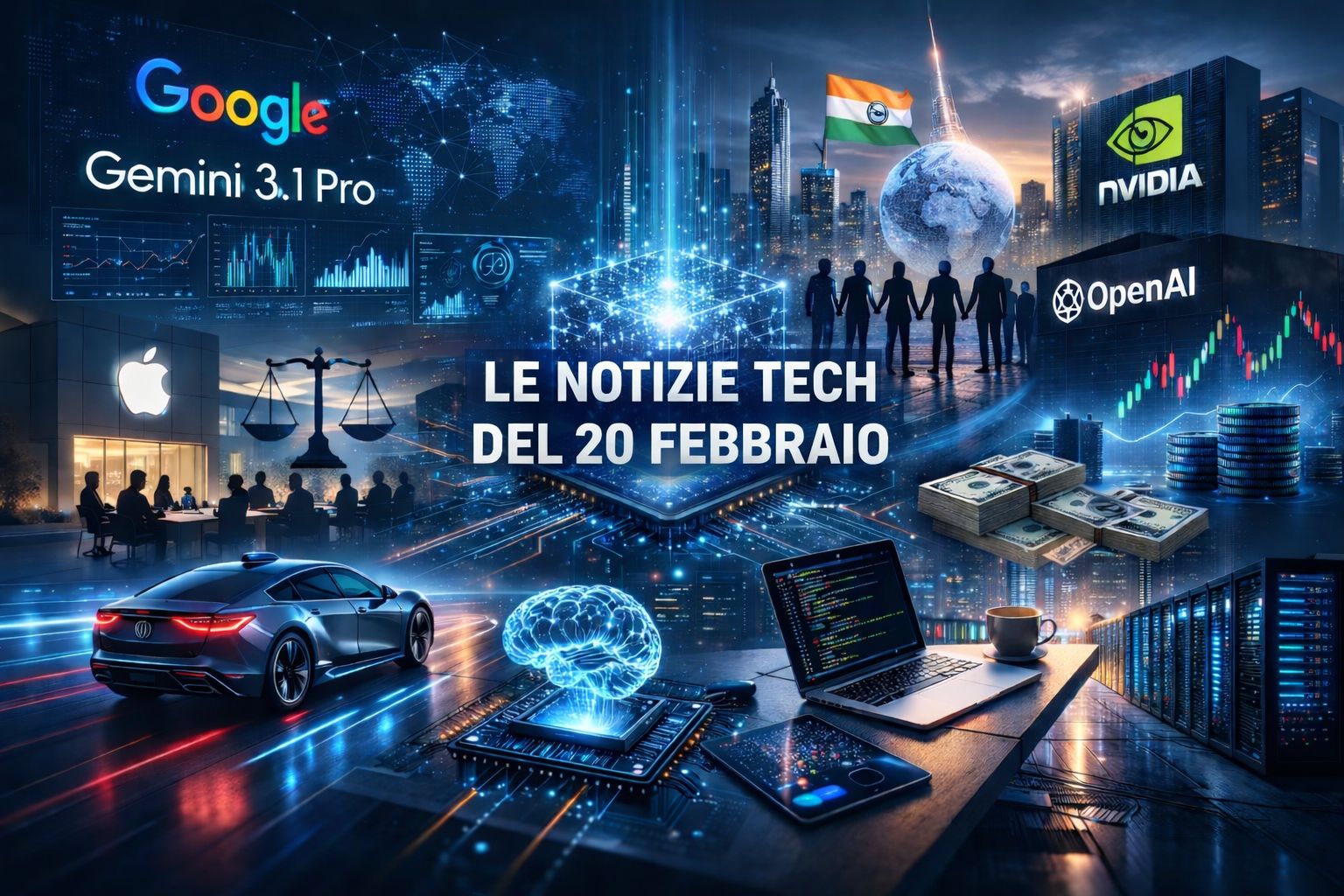 La giornata del 20 febbraio si concentra su tre assi principali: il nuovo modello di punta di Google nel campo dell’intelligenza artificiale, le manovre finanziarie attorno a OpenAI con il possibile ingresso massiccio di Nvidia, e le tensioni politiche e industriali emerse durante l’AI Impact Summit in India. Sullo sfondo, nuove cause legali nel settore tech, movimenti nel mondo social e un’ondata di finanziamenti a startup AI, semiconduttori e infrastrutture.