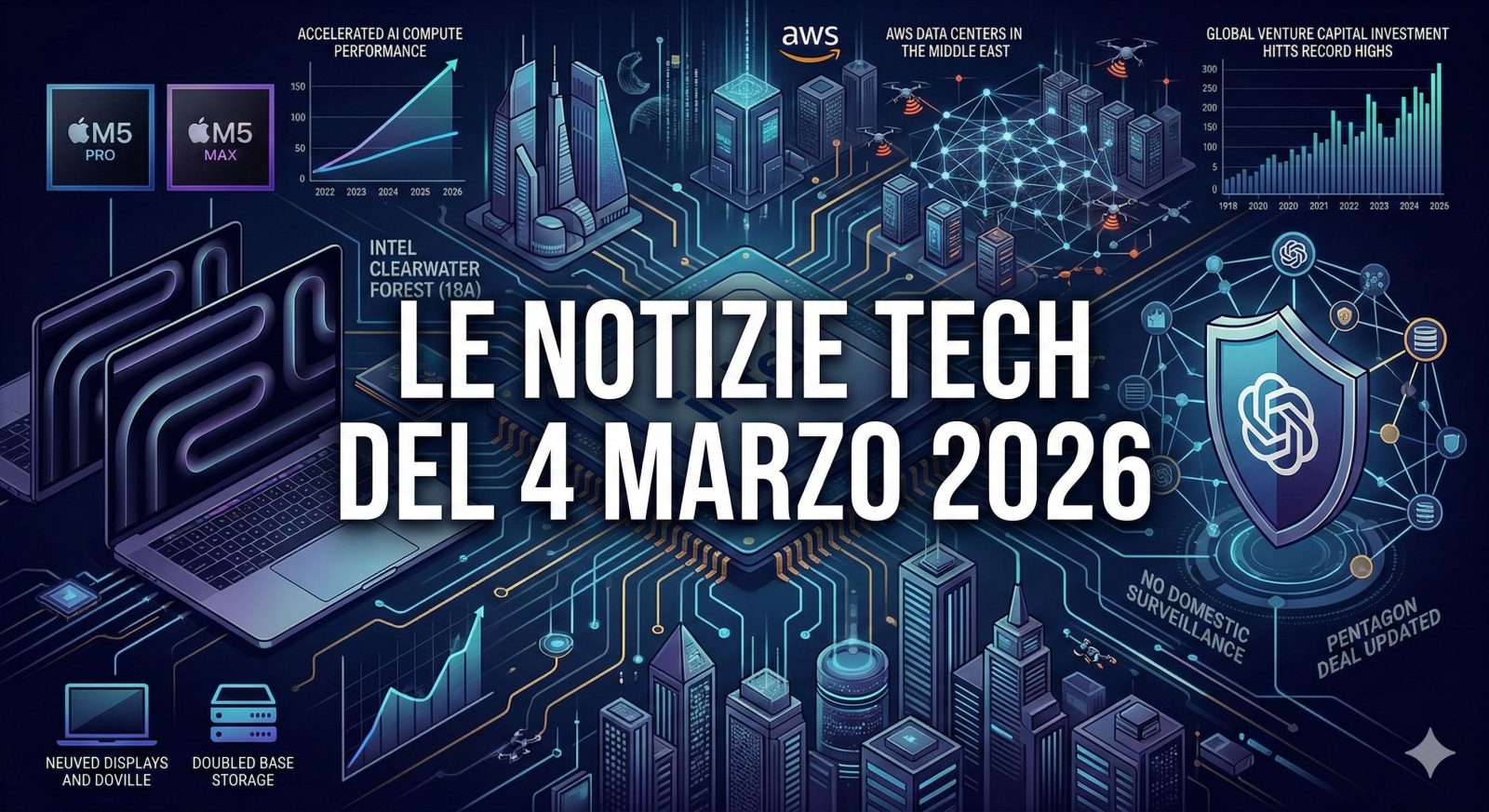 La giornata tech del 4 marzo 2026 vede protagonista Apple con l’introduzione dei nuovi chip M5 e il rinnovo dell’intera linea MacBook Pro e Air, puntando fortemente sull’intelligenza artificiale, sebbene non manchino critiche sulle reali prestazioni e l’aumento dei prezzi. Parallelamente, OpenAI cerca di mitigare le controversie sul contratto con il Pentagono, introducendo clausole contro la sorveglianza domestica. Il settore registra anche lanci software da parte di Google con Gemini 3.1 Flash-Lite e notizie record negli investimenti globali nel venture capital legati all’AI, nonostante le crescenti tensioni geopolitiche in Medio Oriente che influenzano le infrastrutture cloud.