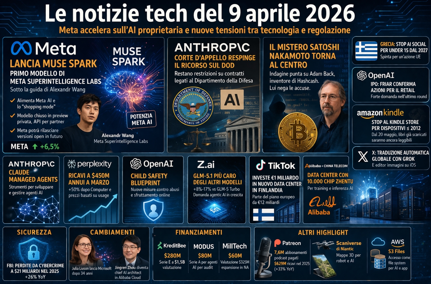 La giornata si concentra su due direttrici principali: il rafforzamento dei modelli proprietari da parte delle big tech e l’intensificarsi delle tensioni tra aziende, governi e sicurezza nazionale. Accanto a questi temi emergono segnali rilevanti su infrastrutture, regolazione dei social, cybersecurity e nuovi equilibri economici nel settore AI.