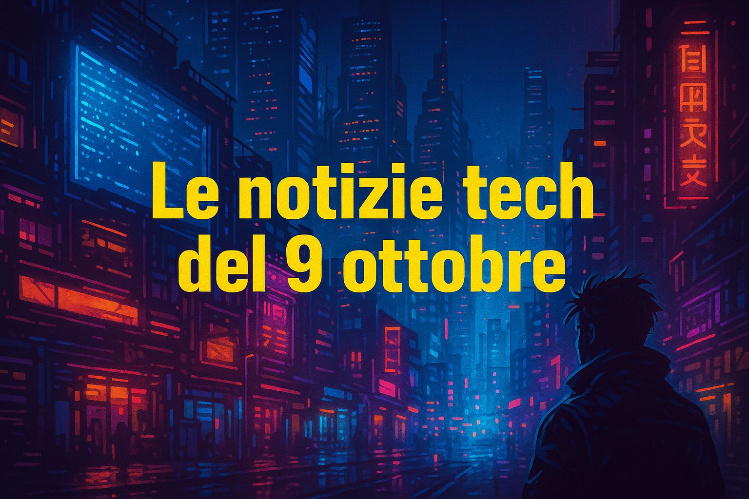 Procedo con la creazione dell’immagine orizzontale cyberpunk con il titolo “Le notizie tech del 9 ottobre”?