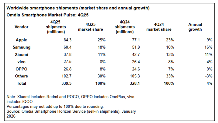 La domanda è rimasta sostenuta sia dal ciclo di aggiornamento dei dispositivi sia dagli acquisti di sostituzione, in un contesto macroeconomico incerto che non ha però impedito a diversi produttori di registrare risultati record. Il quarto trimestre del 2025 ha chiuso con una crescita del 4% su base annua, sostenuta dalla stagionalità e da performance particolarmente solide di alcuni brand.