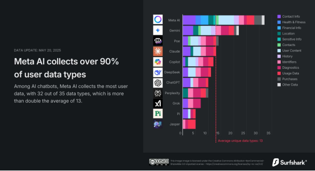 Secondo un’analisi di Surfshark, azienda specializzata in cybersicurezza, il chatbot di Meta raccoglie una quantità di dati personali mai vista prima tra le app di intelligenza artificiale. Con 32 su 35 categorie di dati collezionate, Meta AI si piazza al primo posto tra gli strumenti più invasivi e stacca nettamente Google Gemini, fermo a 22.