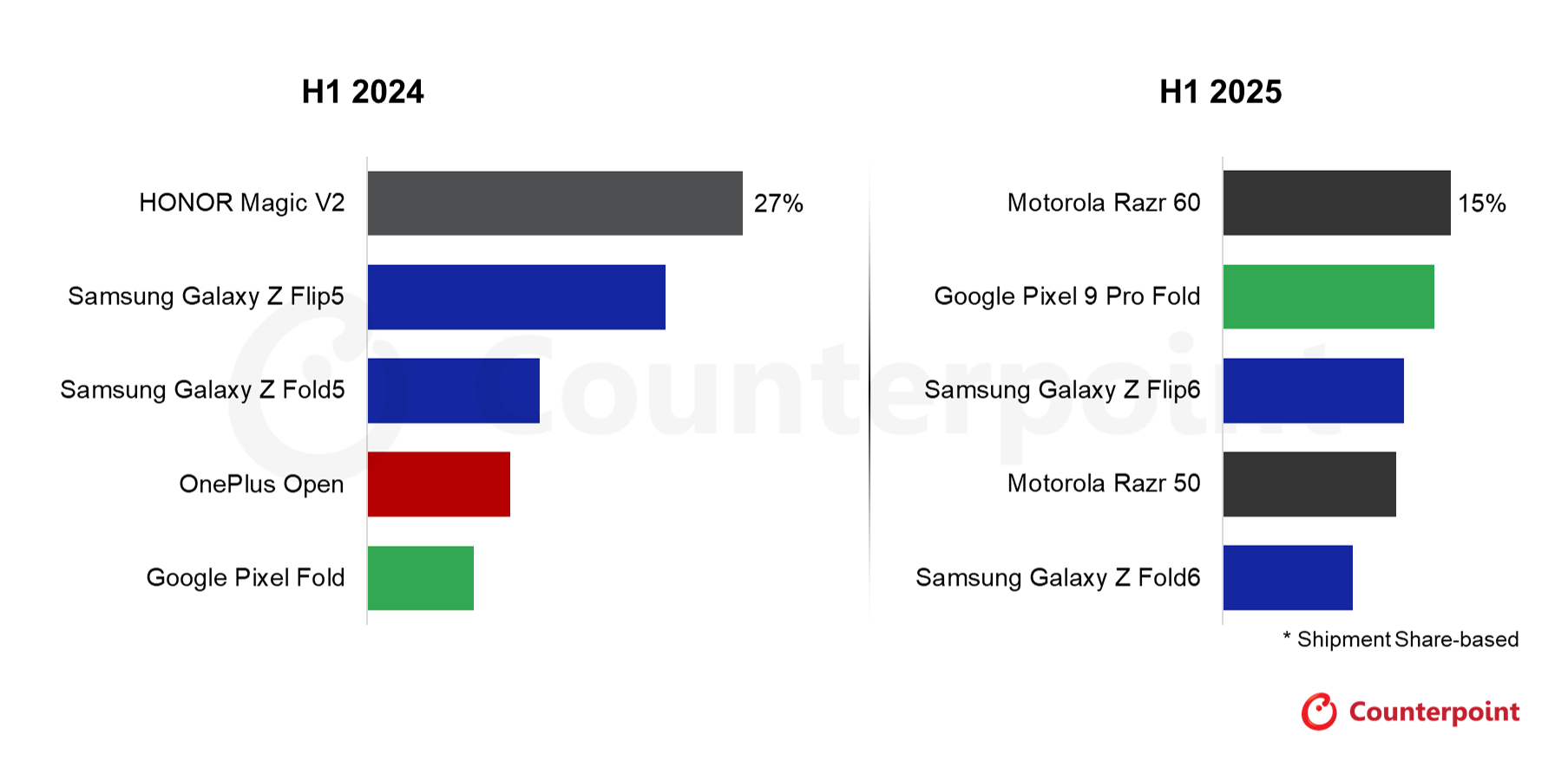 Nel primo semestre del 2024, il Magic V2 di HONOR e il Galaxy Z Flip5 di Samsung superavano ciascuno il 20% delle spedizioni, concentrando la maggior parte del mercato. Un anno dopo, la situazione appare radicalmente diversa: Motorola Razr 60 guida con il 15%, mentre combinato con il suo predecessore Razr 50 raggiunge circa il 27%, lo stesso livello delle performance record dei top brand dello scorso anno.