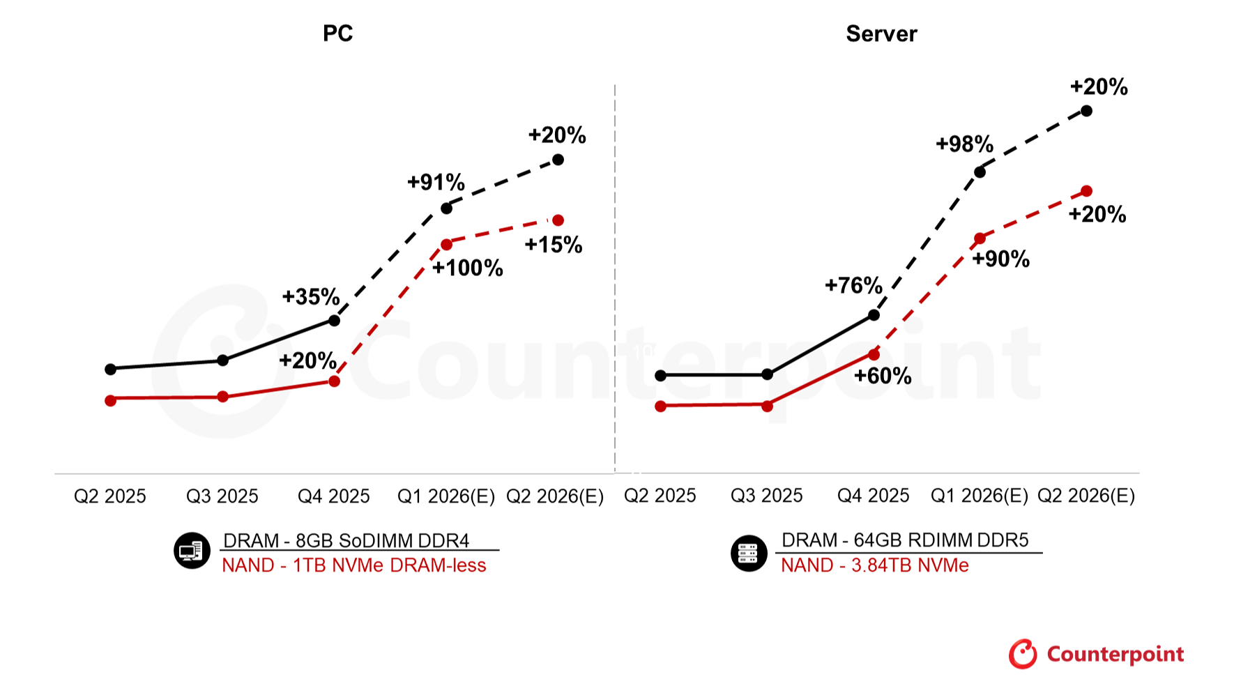 Nel primo trimestre del 2026 il mercato delle memorie registra un incremento dei prezzi senza precedenti. Secondo il Memory Price Tracker di Counterpoint Research, le quotazioni di DRAM, NAND e HBM risultano più alte dell’80-90% rispetto al quarto trimestre 2025, con un impatto esteso a tutti i principali segmenti, dai server ai dispositivi consumer.